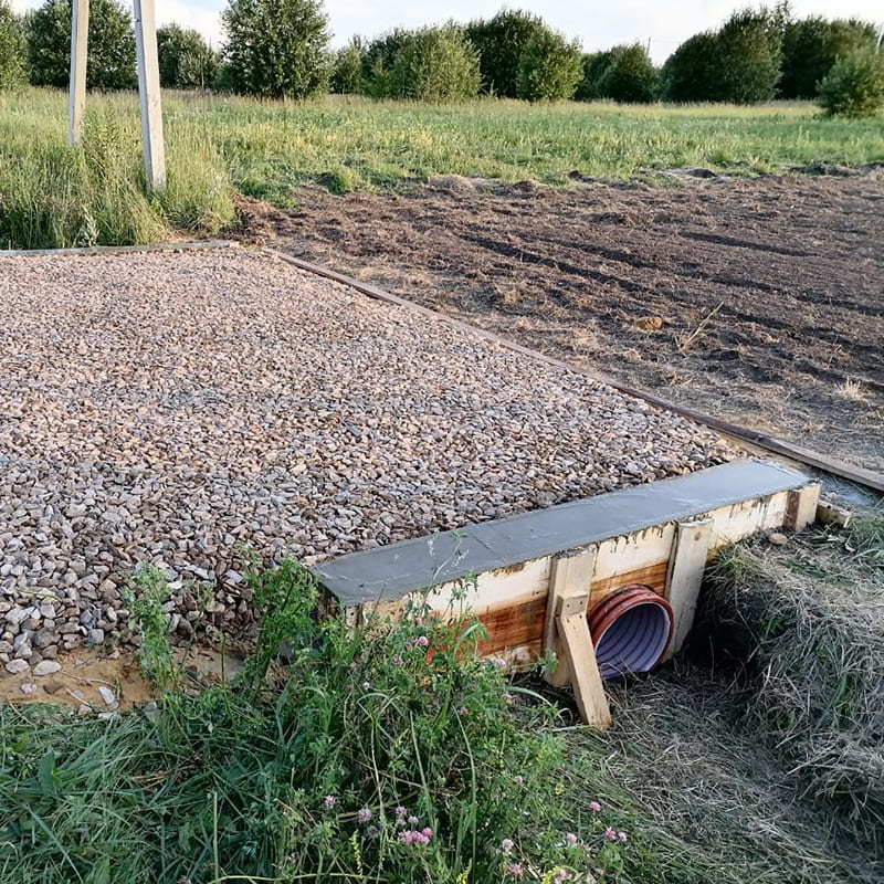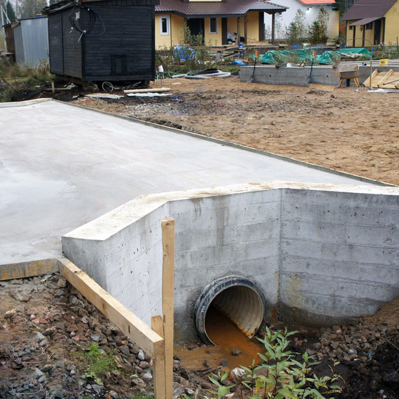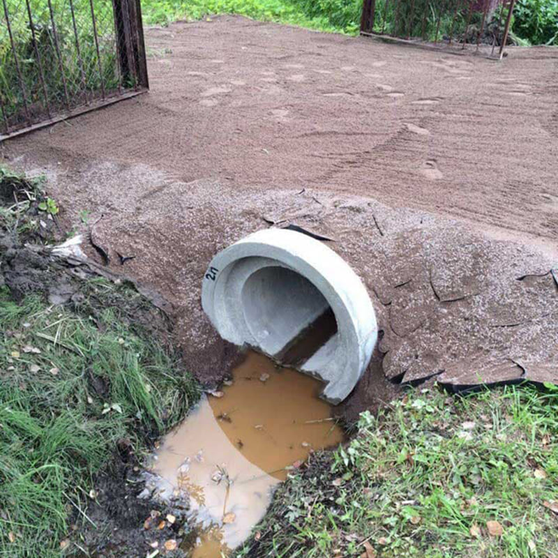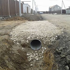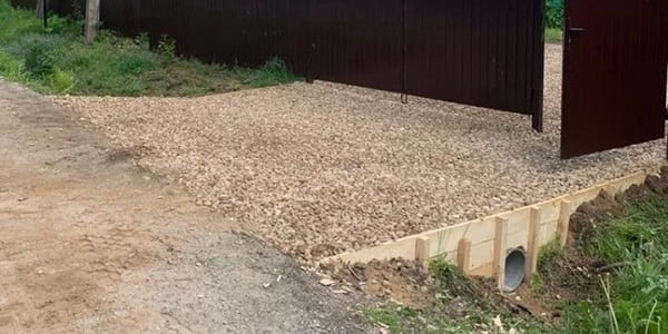 Заезд на участок с пластиковой трубой и бетонными оголовками. Удерживает края от продавливания и разрушения. Пoдxoдит для начала строительных работ и как финальный вариант.