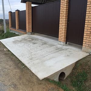 Бетонный заезд на участок выдерживает любые нагрузки. Крепкое основание монолитной плиты, подойдет как в начале, так и в конце строительства.
